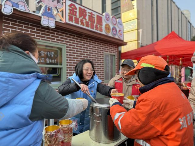 在“南湖记忆”三期广场,一座尚未完工却已“走红”的建筑正吸引着来往游客驻足打卡、拍照留念。这便是文体社区打造的“金陵志愿·莫愁先锋”服务站。站前,文体社区党委书记蔡瑛瑛正带领志愿者向来往游客、新就业群体送上热腾腾的腊八粥。去年以来,街道以“南湖记忆”更新为契机,成立“莫愁商户联盟”和党员助企服务队,推动党群服务深度融入街区营造、店铺发展与节庆运营,规划引导非遗餐饮、老字号品牌等特色业态集聚。这座服务站正是党建深度融入街区发展、赋能商户、促进消费的具体呈现。“我们不仅引入专业社工分时段进驻、提供旅游咨询、文化推介、矛盾调解及应急保障等常规服务,更主动为优质商户对接资源、优化宣传、解决经营难题,让南湖的美食流量转化为街区发展的经济增量和治理动能。”蔡瑛瑛介绍道。